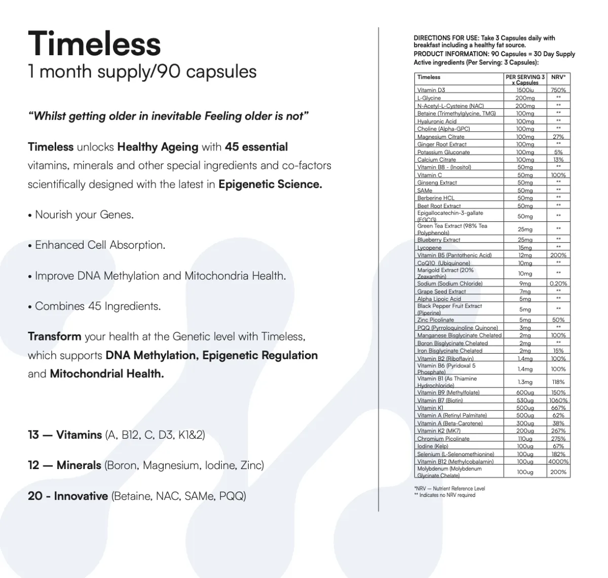 Timeless is frequently used within longevity, preventative health and high-performance settings. It supports cellular health and ageing pathways and is often paired with epigenetic insight.